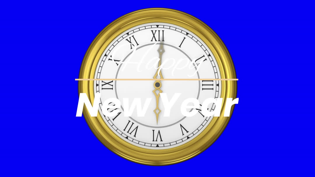 Gold-edged clock with Roman numerals and white-loaded Happy New Year text adds a celebratory and time-sensitive look intense blue colors perfect for New Year's promotions, parties invites promotions media projects conveying Joy anticipation welcoming upcoming new year youth spirit.