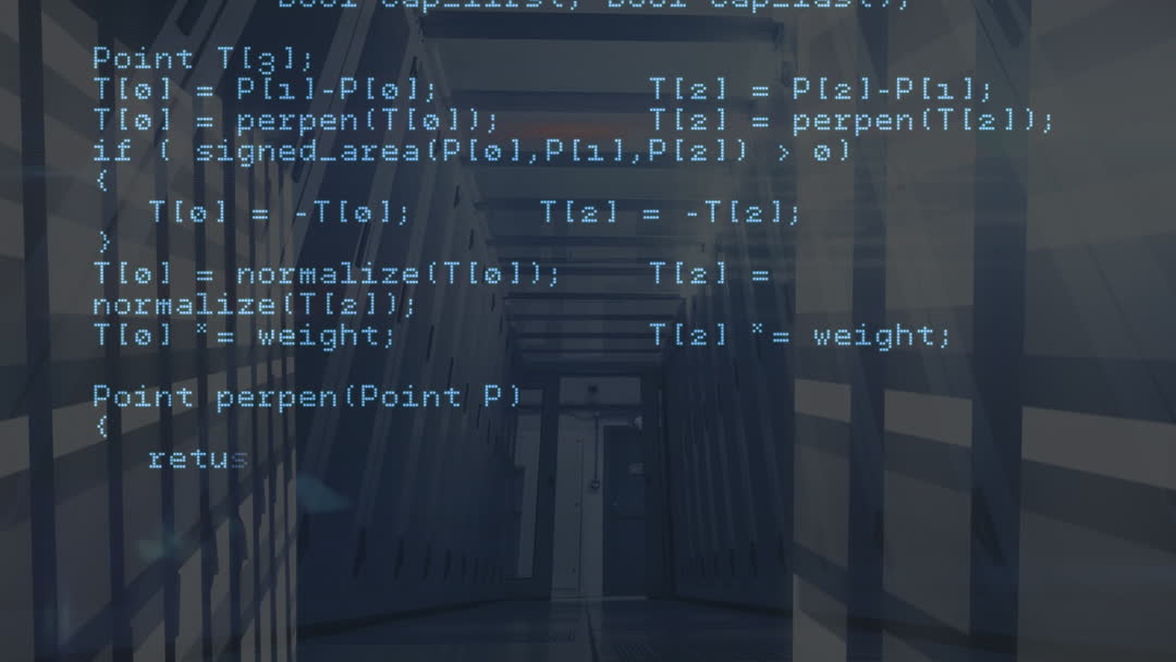 Dynamic blend of animated coding script and server interiors captures the essence of data processing and digital interfaces, ideal for technology webinars, IT blogs, and digital marketing presentations.