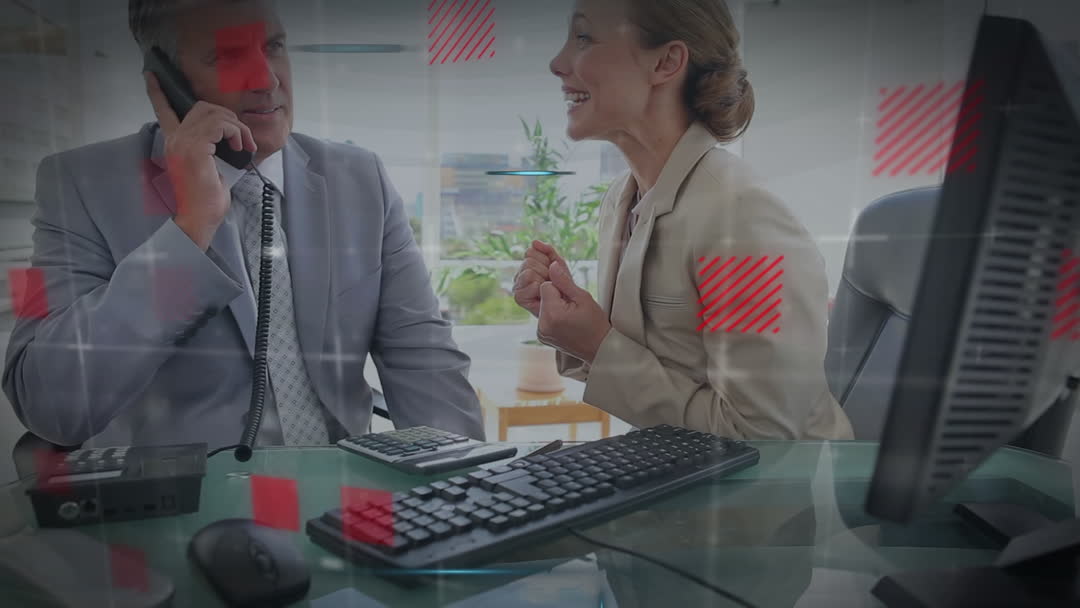Joyful female in office converses with male co-worker during phone call, emphasizing teamwork elements. Illustrative digital red squares display enhancing modern technology visual. Suitable for business communication and collaboration themes in contemporary workplaces.