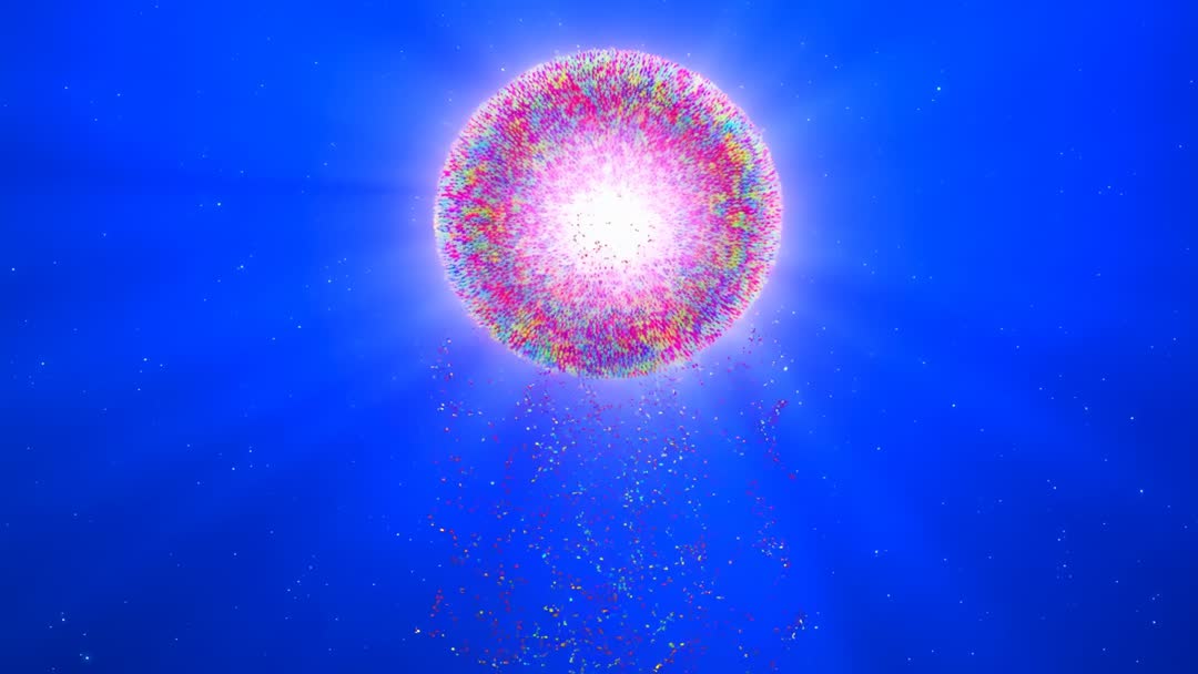- Animated Confetti Sphere Emitting Radiant Core and Falling Particles in Deep Blue Void