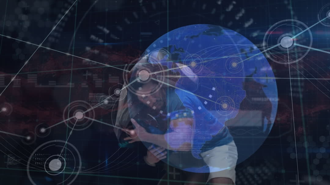 An animated depiction featuring rugby players with layers of digital interfaces and connection visuals, illustrating data processing. Useful for portraying the intersection of sports with technology and trends in data analytics for athletic training or sports networks.