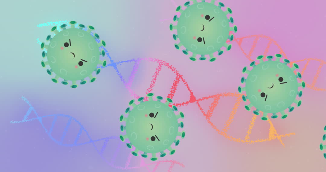 Animated depiction of COVID-19 virus cells with angry expressions moving over vibrantly colored DNA strands is complex and appealing. Ideal for health education videos, informative presentations regarding the pandemic, healthcare campaigns, or illustrating scientific discussions about coronavirus and genetic information.