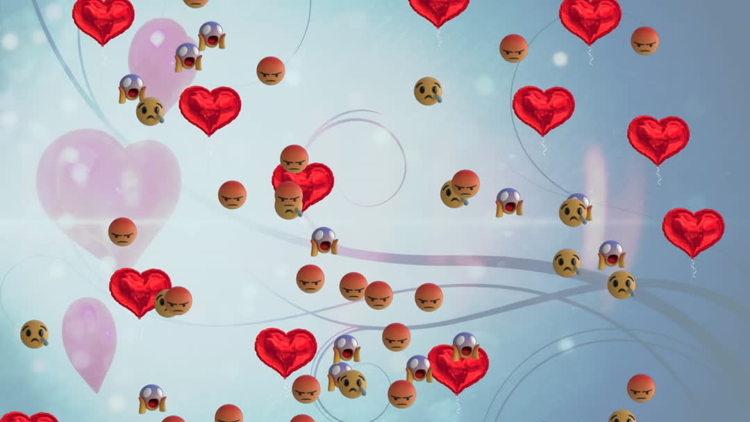 This animation depicts COVID-19 virus symbols mingling with heart-shaped balloons on a delicate light background that conveys themes of conflict and emotion in a global health context. Reaction emojis mixed among virus icons vividly illustrate public sentiment the pandemic evokes. A juxtaposition of health effects against softer, heart-based videory, this visual can be used in videos addressing pandemic response, emotive digital campaigns, blogs highlighting public health conflicts, mood apps, and health education materials focused on the pandemic's dual effects on emotions.