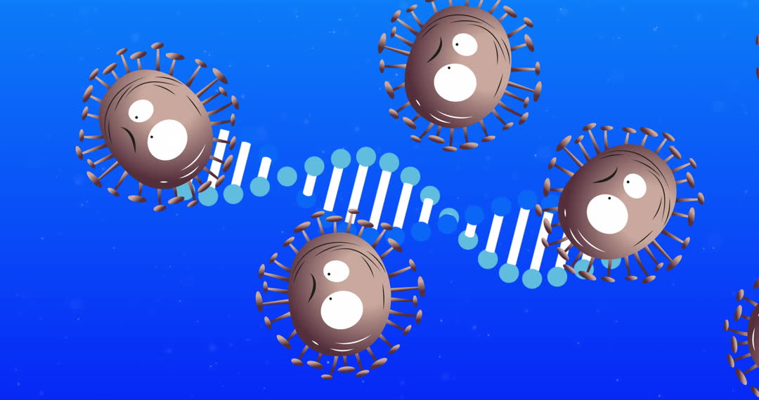 A 3D animation depicts COVID-19 virus cells with sad expressions moving around while a DNA strand spins in the background. The illustration serves as a visual representation of the global pandemic and can be used for educational purposes in healthcare and biology settings. It may be useful for blogs, websites, or presentations that discuss the impact of COVID-19 or explain scientific concepts related to the virus.