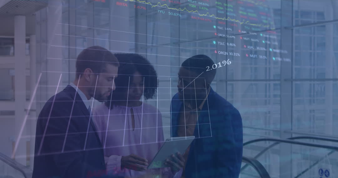 Visual representation shows diverse professionals engaging in a business meeting with animated data processing graphics overlay, emphasizing technology integration in modern workplaces. Ideal for illustrating themes of technology-driven business strategies, financial analysis workshops, multicultural team dynamics, and digital interface role in decision making.