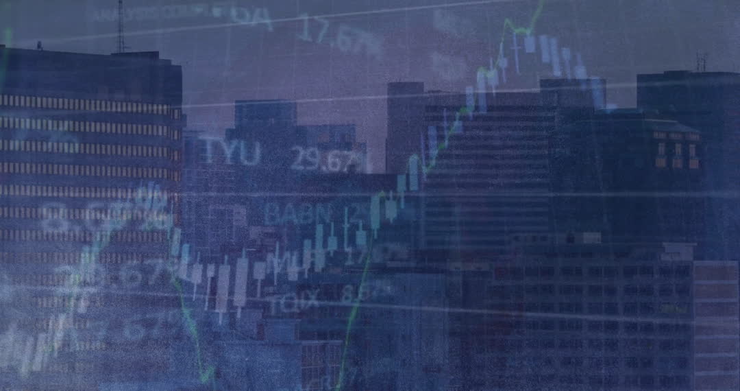 Overlay of financial statistics and data processing graphics on a cityscape, symbolizing the integration of urban environments with financial data analysis. Useful for presentations on global finance, economic trends, and digital transformation of urban planning.