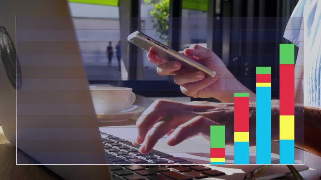 This visual underscores the concept of data processing and financial analysis in the global business context. By showing a dynamic graph overlay with a person using digital tools like a smartphone and laptop, it emphasizes the connectivity and real-time analysis indispensable in today's marketplaces. Useful for illustrating financial trends, technological development or the impact of digital technology on modern business operations.