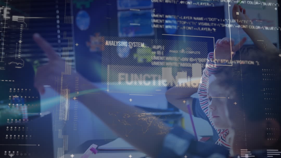 Futuristic animation and data overlays young students in a classroom environment. Technology-themed material, ideal for illustrating the impact of data science on education. Use in educational content exploring future technologies tools in learning environments.