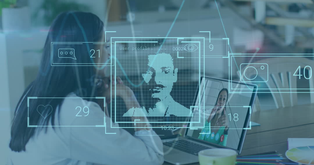 Virtual meeting with digital data overlay illustrates modern communication and technological innovation. Perfect for articles on remote work, tech developments, video communication, or social media analytics.
