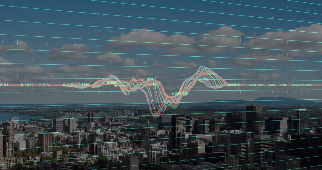 This scene illustrates the integration of technology over a metropolitan city with digital lines and graphs, symbolizing global communication and data exchanges. Ideal for presentations on urban technology, smart cities, or futuristic infrastructure planning projects.
