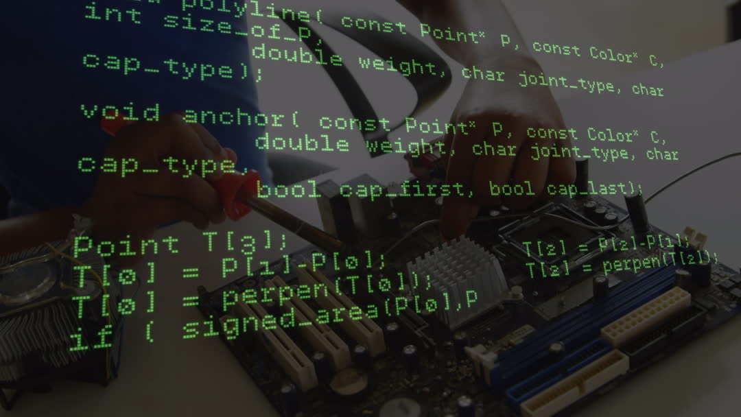 Animation showcasing digital data processing superimposed over two African American schoolgirls exploring technology and coding concepts in an educational or classroom environment. Ideal for illustrating themes of STEM education, inspiring young students into technology fields, and showcasing innovation and future digital learning environments.