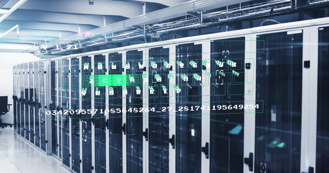 Image portraying animated data processing overlaying a modern server room, suggesting concepts of innovative technology in business data storage. Useful for technology companies, digital infrastructure promotions, and those focusing on network data solutions.