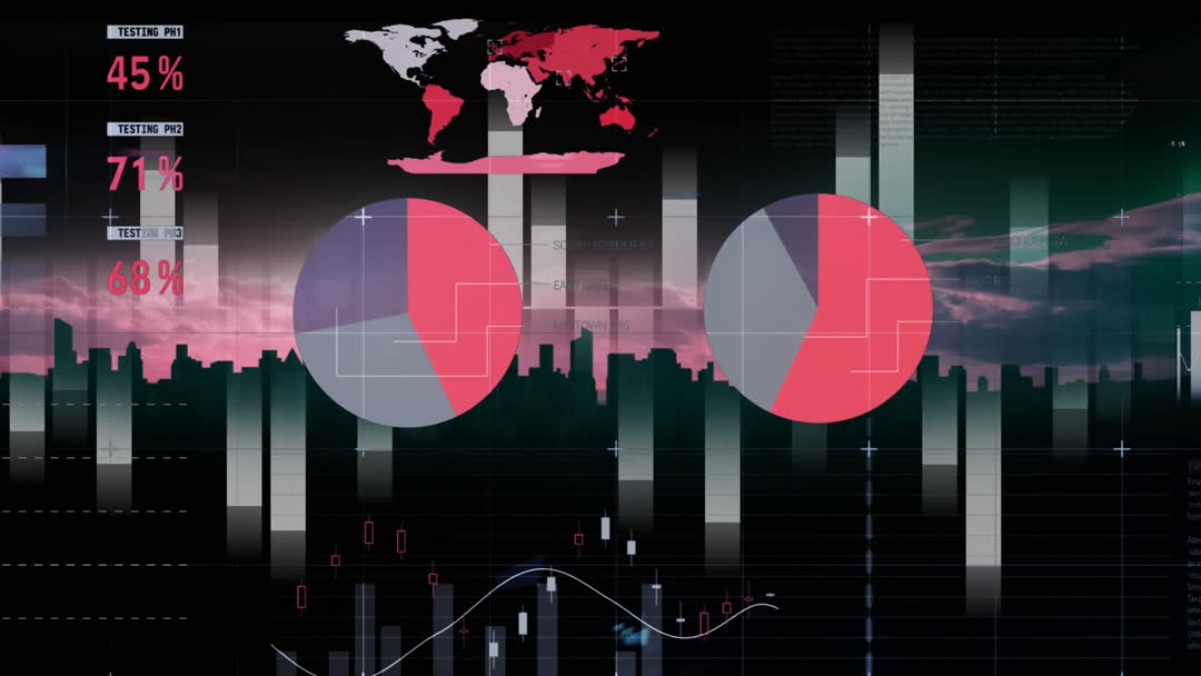 Animation features digital analytics with colorful pie charts, bar graphs, and a global map highlighting statistics overlays on a city skyline. It can be used for illustrating business data analysis, technology in finance, or digital transformation content, ideal for presentations, technology websites, and digital reports.