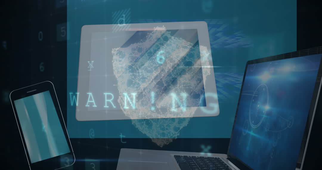 Depiction of animated data processing visuals overlaid on electronic screens including laptops, tablets, and smartphones. Useful for illustrating digital research concepts, cybersecurity warnings, or advanced technology presentations. Could enhance content on future tech innovations, security alerts, and digital ecosystems.