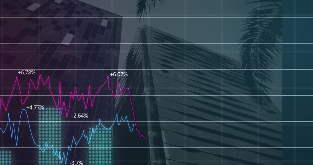 Dynamic visualization of data metrics overlaying a city skyline highlighting data-driven global business themes. Useful for stock market analysis interpretations, financial services presentations, modern economy videory, and digital marketing illustrations.