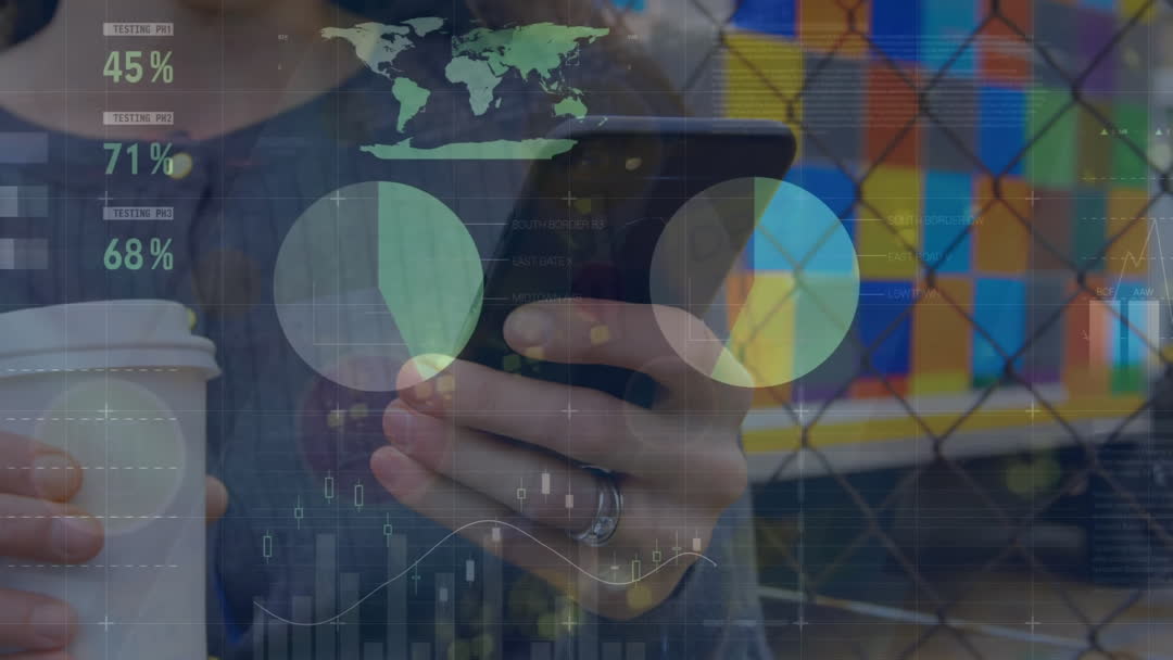 Animated graphics show detailed data and analytics overlaying the use of a smartphone, suggesting themes of technology and innovation. Perfect for illustrating modern finance, business trends, and digital tools. Suitable for use in presentations, websites, and educational materials focused on technological advancements and global communications.
