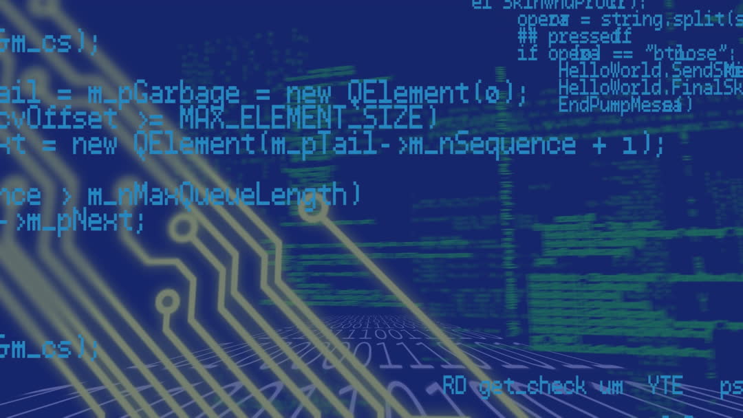 Animation features data processing with overlay of blue circuit board pattern. Perfect for illustrating technology, coding tutorials, and digital innovation concepts. Ideal for use in presentations, technology blogs, or education materials focused on IT and digital infrastructure.