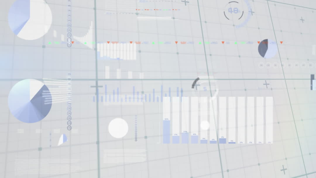 This animation showcases various data processing elements with graphs and charts over a clean white background. It is ideal for presentations or advertising in contexts involving business intelligence, data analysis, or financial forecasting. The intricate interaction of data visuals represents modern technology and digital interfaces, making it perfect for tech-oriented content.