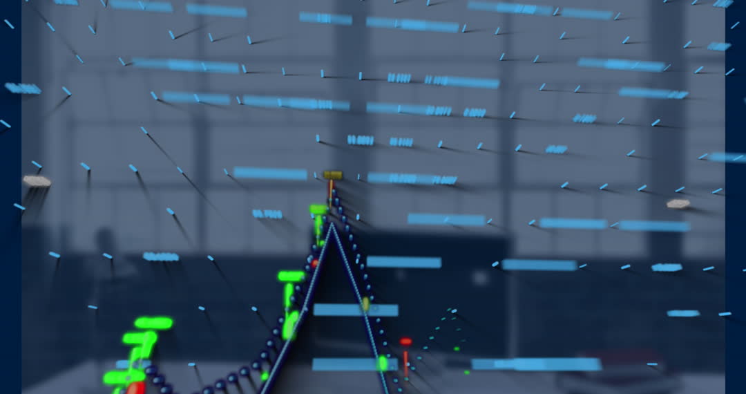 Animation displays data processing and graph analysis in a modern office environment, emphasizing global business trends and digital interactions. Augmented analytical lines and nodes create a dynamic, technological atmosphere. Suitable for presentations on technology in business, digital transformation, and data-driven insights.