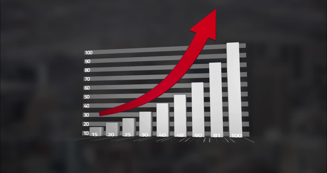 Digital animation shows a futuristic bar chart with a vivid red arrow representing business and financial growth. Background includes a cityscape, suggesting global connectivity. Useful for finance presentations, business growth strategies, stock market analysis, and digital marketing materials.