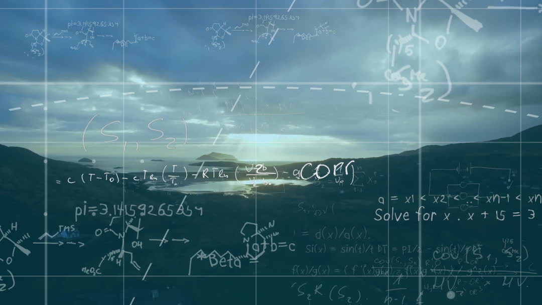Animation depicting an intricate interplay of data processing and mathematical formulas over a snowy landscape background. Perfect for illustrating concepts of global computing and data processing in digital content, educational materials, or presentations on technology and mathematics.