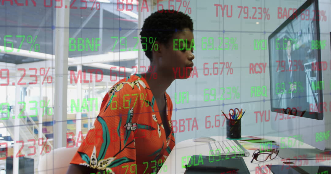 A businesswoman in a modern office engages in a video call with stock market data projections overlaid on the scene. This dynamic blend of personal interaction and data graphics highlights collaborative work in the digital age, reflecting the integration of technology in modern business environments. Suitable for illustrating themes of global business, communication, and technological workflows.