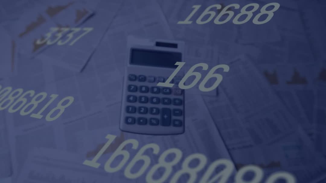 Animation shows numbers changing against a backdrop of a calculator falling over documents, symbolizing data analysis or financial calculations. Ideal for presentations focused on business technology, financial services, tech innovations, or data analytics. Useful in online educational content about number-crunching or financial planning.