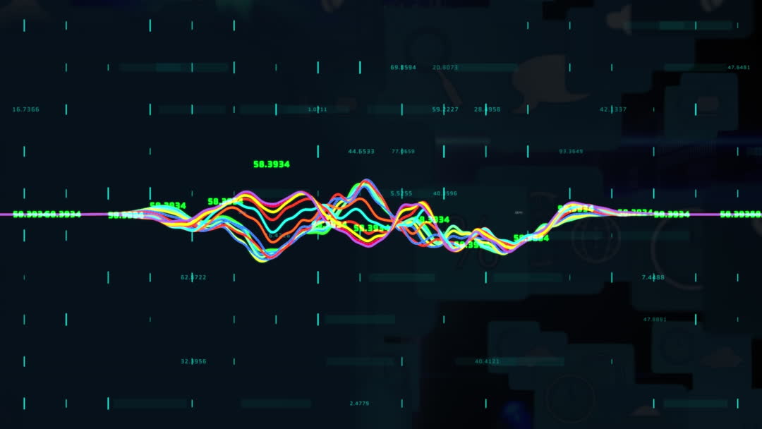 Digital animation captures intricate data visualization with colorful lines forming an analytical graph similar to a radar display. Useful for illustrating concepts in technology, big data analysis, or future business solutions. Modern aesthetic appeals to ads promoting digital innovation or tech ecosystems.