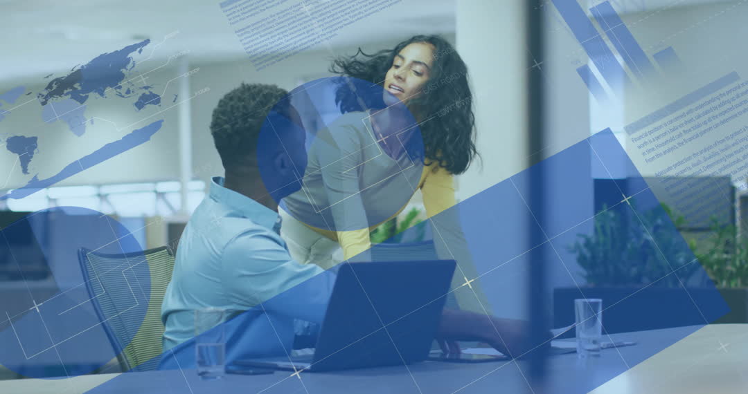 Scene shows a lively representation of modern office dynamics with diverse business professionals interacting. The animated financial data overlays add a dynamic visual element that illustrates the interconnection between global finance and digital culture. Useful for presentations on corporate strategy, financial planning, or digital transformation. Ideal for illustrating teamwork in a technologically advanced workplace.