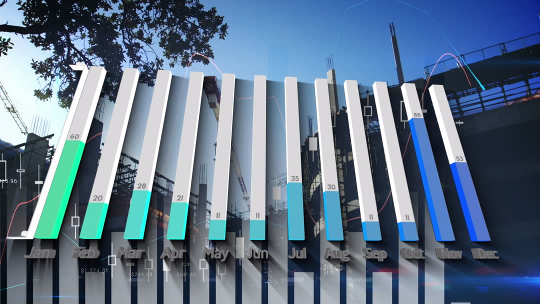 This video shows an animated 3D bar chart overlay on a construction site, symbolizing data analysis and progress tracking. It reflects technological advancements and the integration of digital tools within the building industry. Suitable for illustrating reports or articles focused on construction trends, financial growth strategies, and the role of technology in the industry.