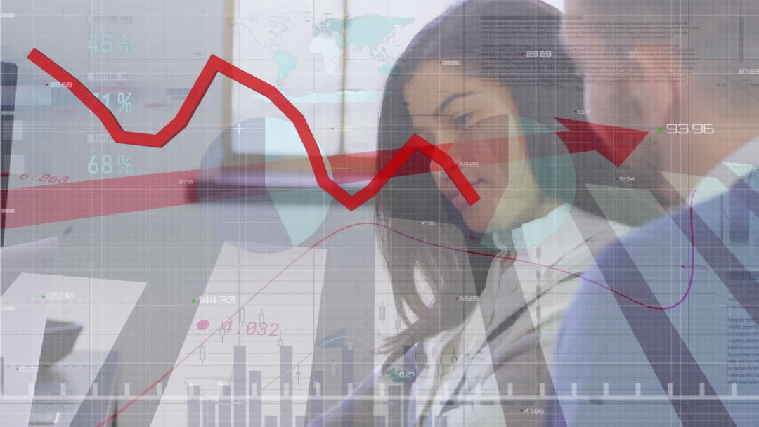 An animated graphic showing data trends and figures overlays a professional environment where a biracial couple works together. This can represent financial analysis, technological innovation, or global business strategies. Useful for conveying themes of collaboration in the financial sector or discussing global economic trends.