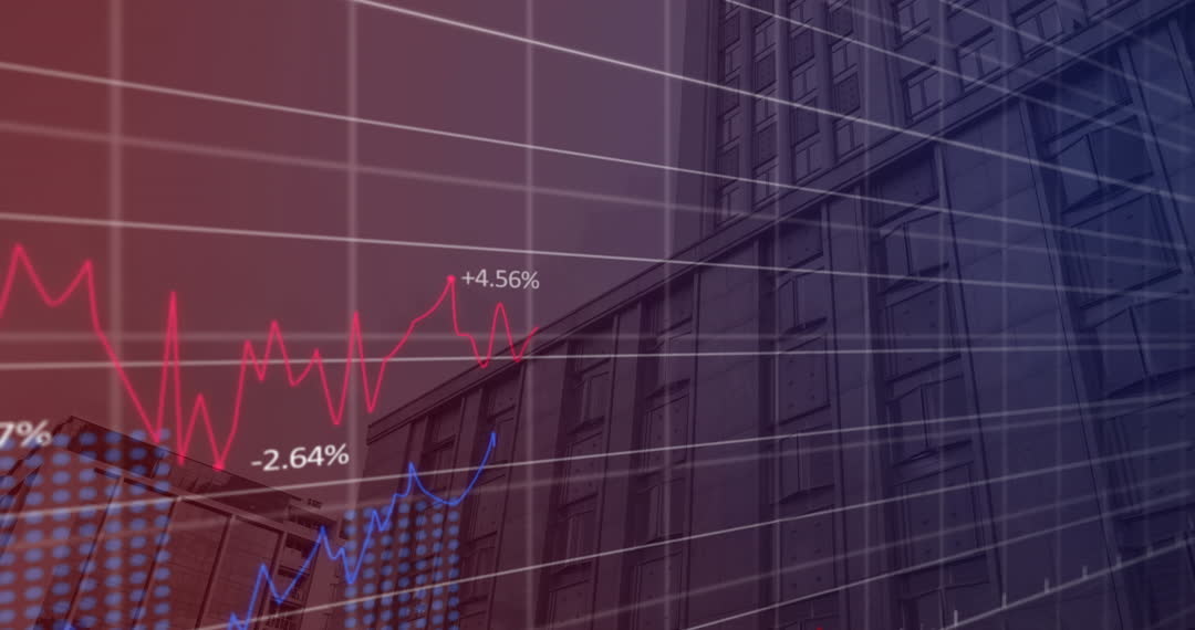 Blurred skyscraper backdrop enhances high-tech, professional look of overlay graph lines and data points indicating stock market or economic analysis. Ideal for use in presentations on finance, global business development, or technological impact on urban environments. Also suitable for websites and articles focused on investment strategies, economic forecasting, or technological advancements in business sectors.