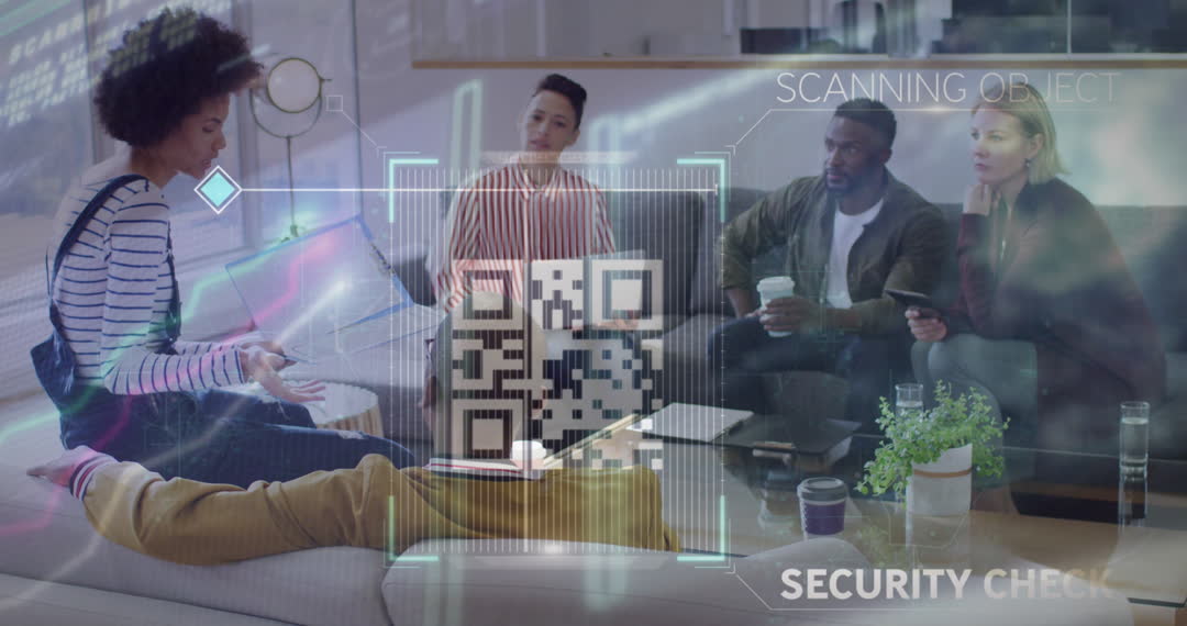 This unique visual portrays a diverse team in a contemporary office setting during a tech-focused meeting. Digital elements such as a QR code and graphics suggesting data processing add a futuristic feel. This video can effectively illustrate themes of technological innovation, modern business practices, or advanced digital security for articles, presentations, or promotional materials in business and technology sectors.