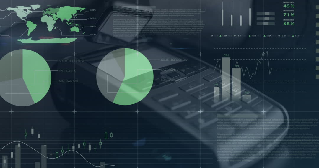 Animated depiction showcases intricate data visualization overlaid on urban scenes, emphasizing modern technology and analytics. Pie charts and graphs highlight global interconnectivity. Ideal for illustrating themes of digital transformation, online analytics, or business intelligence presentations.
