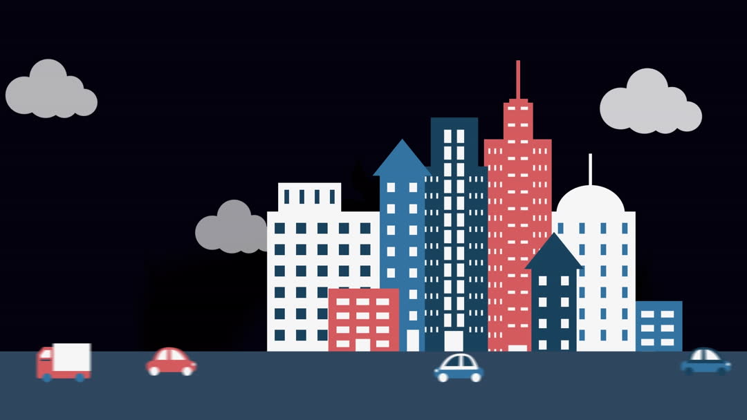 This digital animation showcases a modern cityscape under a dark sky with a variety of small cars driving along. Stylized skyscrapers form the foreground, employing shades of red, blue, and white. This graphic is ideal for websites or presentations focused on technology, urban development, or contemporary design, adding a clean and artistic element to any project.