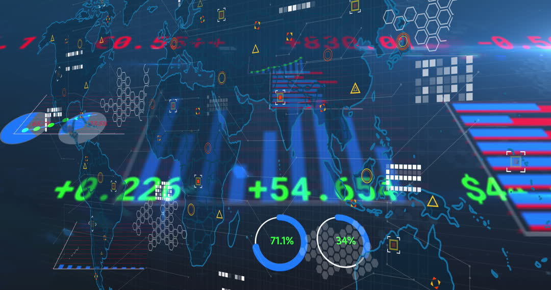 A vibrant, animated depiction of financial and technological data analyzing on a global map and abstract background. Useful for illustrating concepts related to global business operations, financial markets, data analytics, technology trends, and digital transformation in corporate settings. Ideal for presentations, articles, and marketing materials focusing on business intelligence and tech innovation.