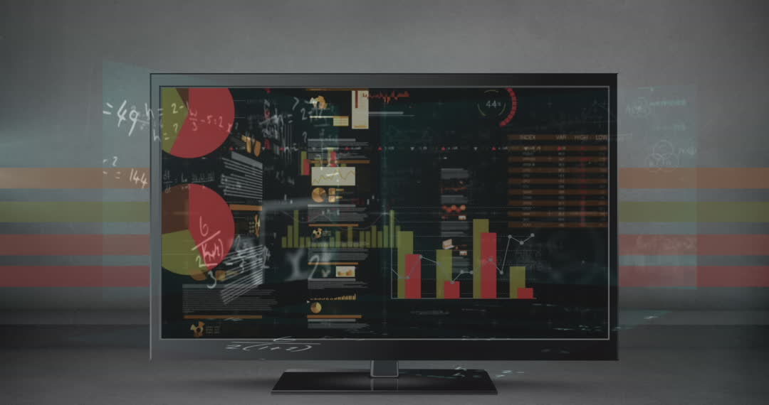 This visual shows a modern screen displaying animated data processing elements including pie charts, bar graphs, and mathematical equations. This concept is useful for illustrating themes related to digital analytics, business intelligence, technological advancements, and data-driven decision making. Ideal for business presentations, educational content on digital transformation, and promotional materials highlighting innovative tech solutions.