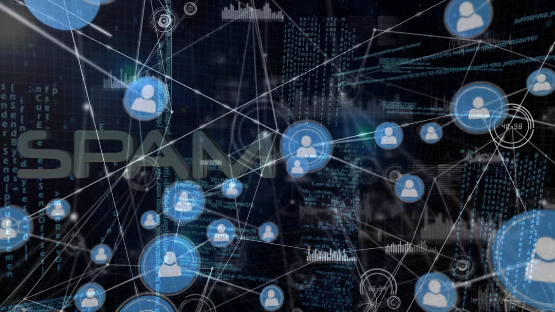 The visual represents a digital network conceptual animation, showcasing interconnected nodes with profile icons indicating connections. The background is filled with dynamic data analytics and technological elements such as string lines and statistical charts. This type of content can be used in projects related to cybersecurity, technological advancements, communication networks, and data management education, illustrating complex virtual data systems, highlighting the concept of spam in networking and security.