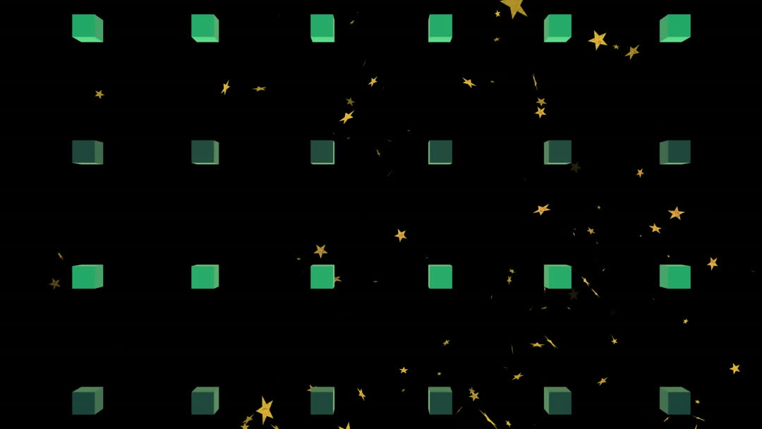 Eye-catching digital animation with green squares and golden stars on black background illustrating versatility in patterns and movement. Ideal for digital marketing, video backgrounds, or visual effects projects that require dynamic and engaging animations.