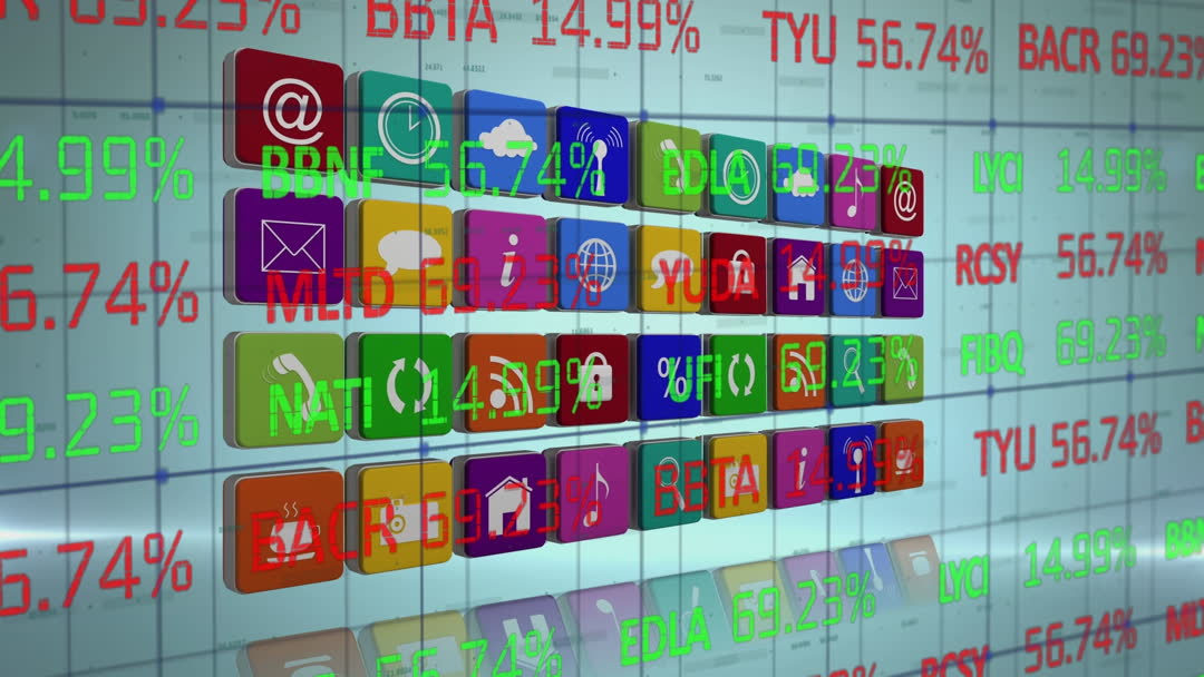 - Animated Digital Technology Icons Setting Against Stock Market Data