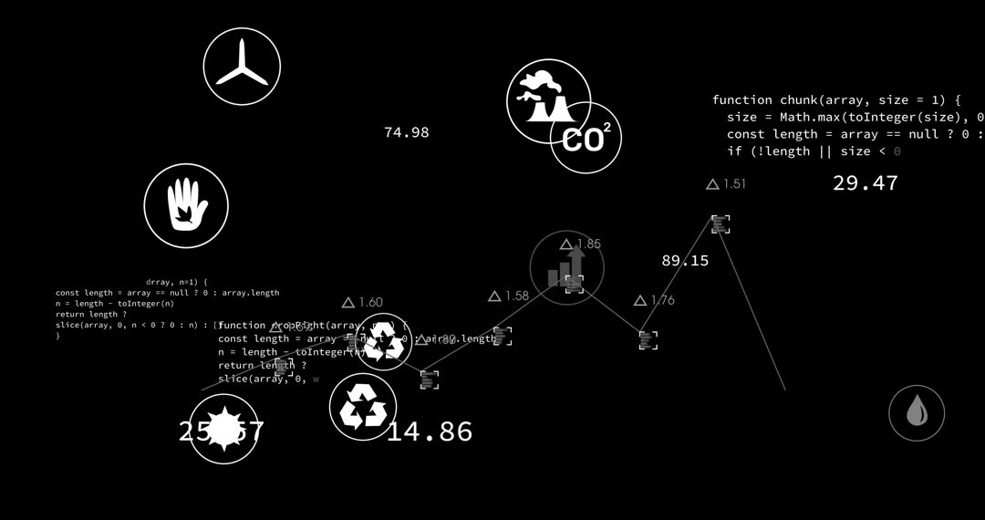 Captured from an interactive animation illustrating environmental shift using digital graphics. The animation uses numeric displays, coding snippets, and icons representing climate indicators such as CO2 emissions and recycling symbols. Visually engaging, this can be used for educational content on environmental technology, digital presentations, or enhancing reports on climate analytics frontiers.