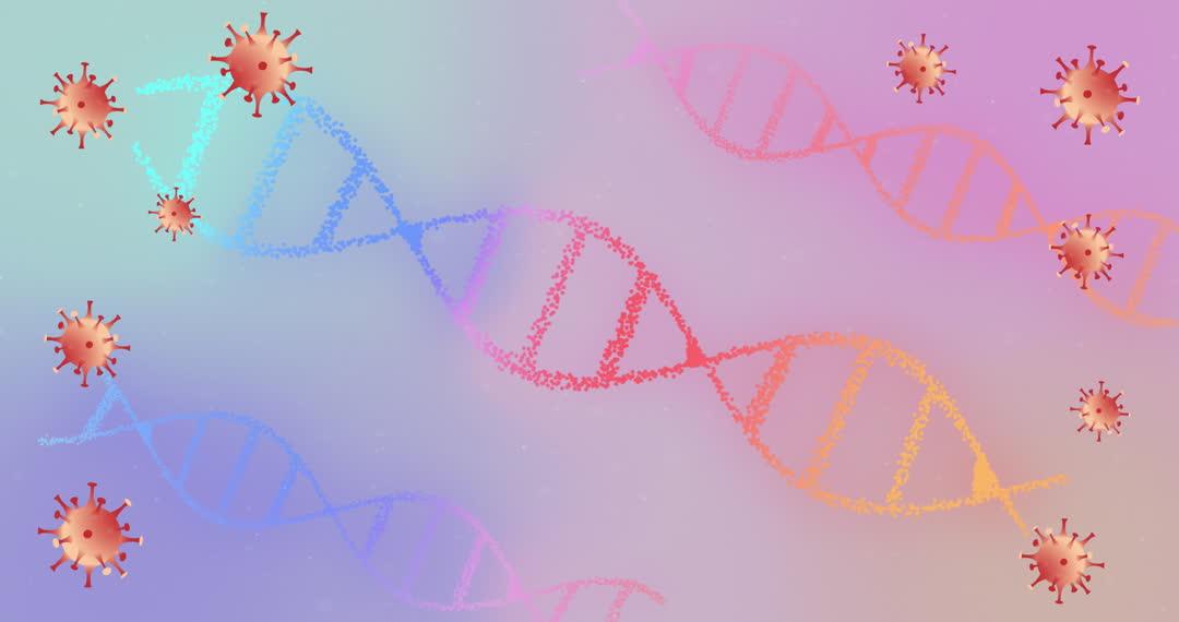 Animated illustration shows covid-19 cells alongside DNA strands on a vibrant gradient background. This graphic creatively combines elements of virus and genetics. Useful for educational content on virology, health seminars, scientific presentations, or digital content related to the global healthcare challenges posed by pandemics.