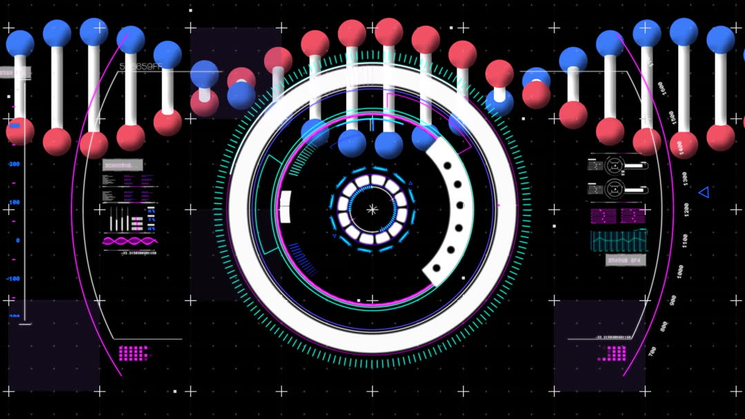 This animation features a rotating DNA strand accompanied by a futuristic digital interface and data processing graphics on a dark background. Useful for biotech presentations, sci-fi projects, or as eye-catching visuals for high-tech applications.