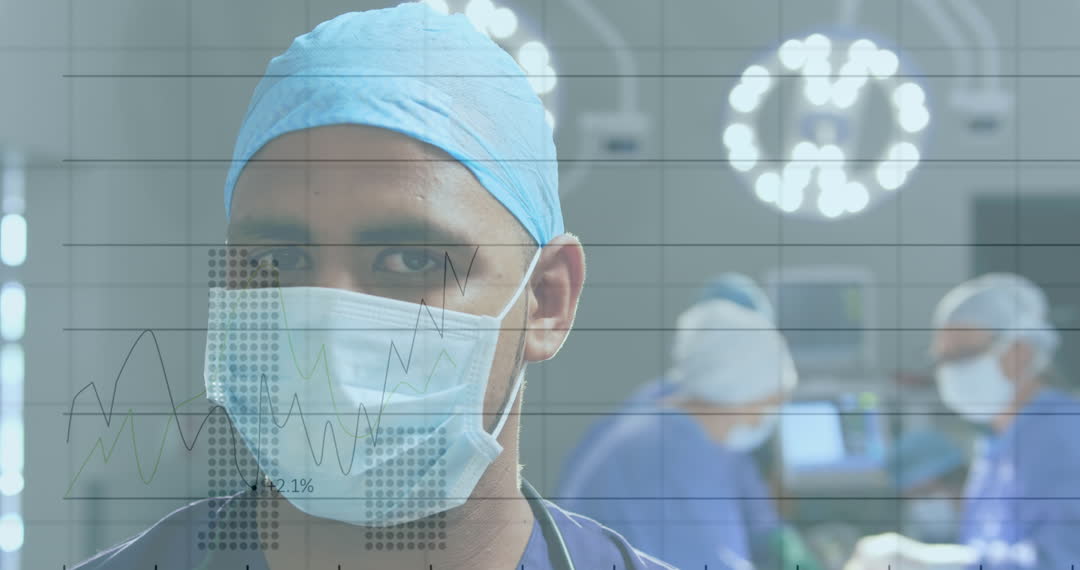 The visual depicts a doctor in a surgical environment with graphical elements representing data analysis overlaid. This promotes themes of medical innovation and digital transformation in healthcare. Ideal for illustrating technological advancements, the intersection of healthcare and big data, or educational content on modern medical procedures.