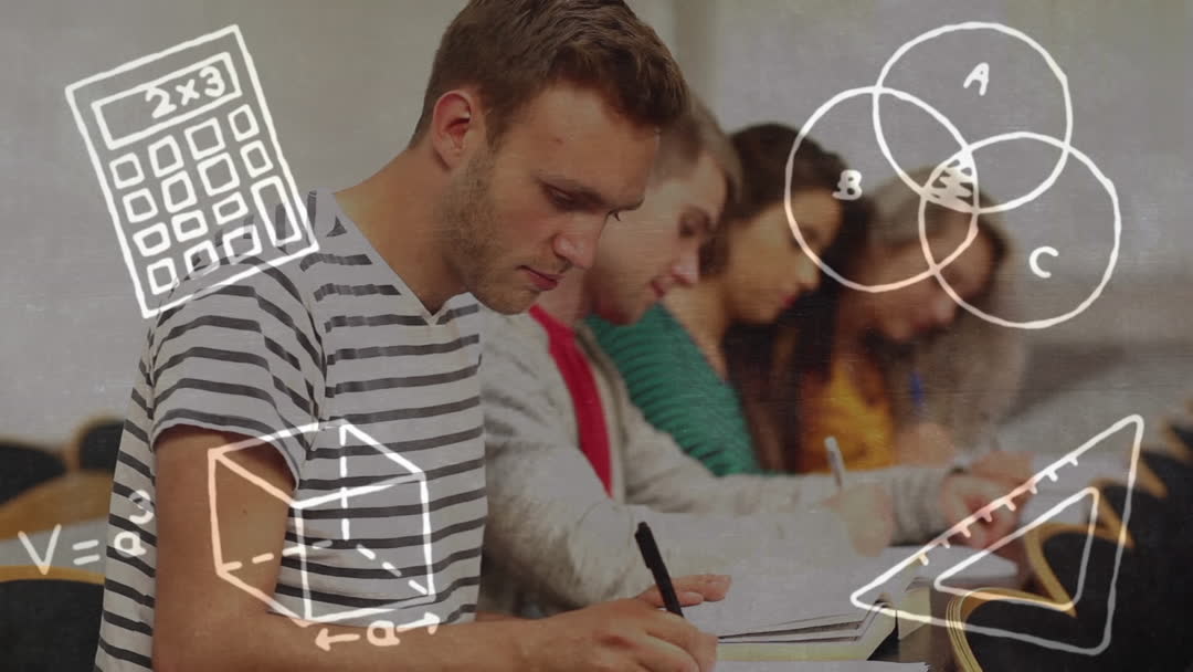Students engaged with laptops in a classroom setting display animated graphics, symbolizing concepts like mathematics and problem-solving. Ideal for education-focused content, depicting modern learning methods, promoting interactive teaching, and emphasizing diversity in education.