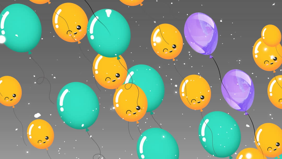Colorful cartoon balloons with happy faces are expressed in digital animation on a grey background. Snowflakes are gently falling around them, enhancing the feeling of a festive atmosphere. This playful scene is perfect for designs related to winter celebrations, holiday invitations, animated party backgrounds, websites featuring festival themes, or any project that evokes feelings of joy and happiness.