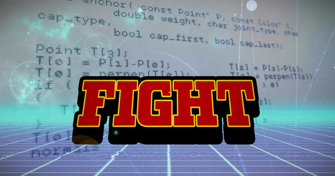 Animated scene features the bold word 'FIGHT' prominently against a backdrop of scrolling digital code and a grid-like digital interface, suggesting themes of technology and competition. Ideal for use in digital marketing, presentations on technology, or media related to video gaming and programming.