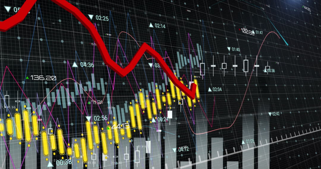 Visual illustration depicts the digital processing of financial data with a focus on analysis and trend modeling. Red downward trend line suggests results of risk assessment or decline. Useful for presentations about stock market trends, financial forecasting, data analytics methods, or digital finance technology.