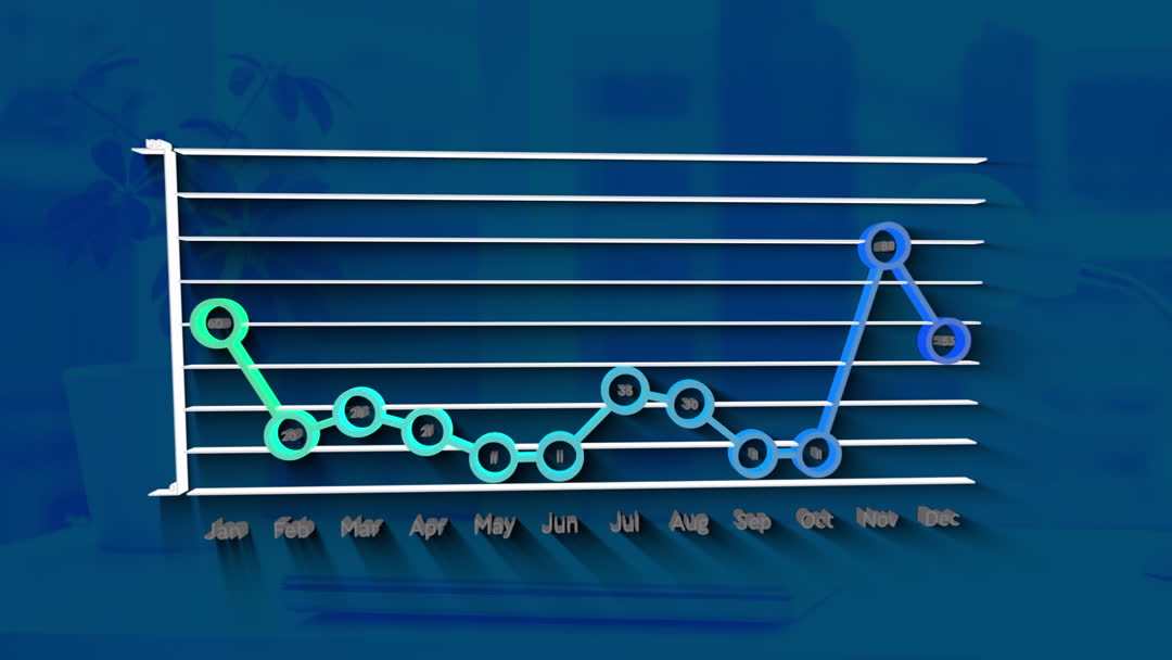 This animated representation of financial data highlights key monthly trends and growth patterns essential for business analysis and decision-making. The video features a graph showing fluctuations and growth over a year. Ideal for use in presentations on finance, global business strategies, or educational materials involving data processing and analytics.
