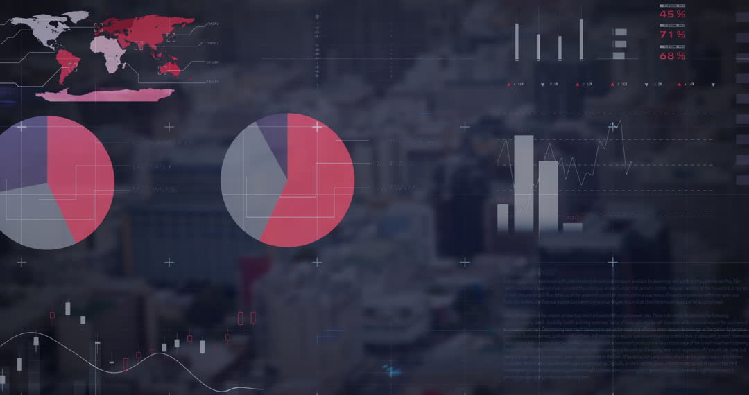 Animation shows financial and statistical data processing over urban background. Ideal for illustrating business concepts, technology interfaces, data analytics presentations, and economic reports.